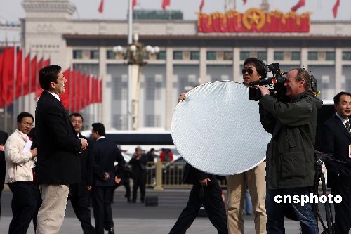 3月10日,外國媒體在北京人民大會堂前現(xiàn)場報道兩會。當日,十一屆全國人大二次會議在人民大會堂舉行第三次全體大會,最高人民法院院長王勝俊、最高人民檢察院檢察長曹建明分別作工作報告。中新社發(fā) 杜洋 攝