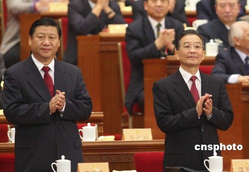 3月12日,全國政協十一屆二次會議舉行閉幕大會。國務院總理溫家寶與國家副主席習近平出席閉幕大會。中新社發 盛佳鵬 攝