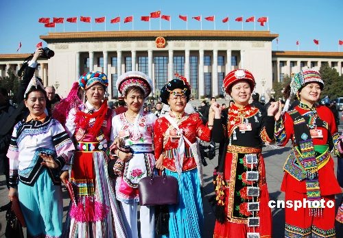 3月13日,一群少數民族全國人大代表參加“兩會”閉幕會后揮手告別,相約明年“兩會”再見。中新社發 韓海冰 攝