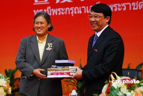 4月7日,泰王國瑪哈扎克里·詩琳通公主殿下和廈門大學(xué)黨委書記朱之文互贈禮品。當(dāng)日,瑪哈扎克里·詩琳通公主殿下出席廈門大學(xué)泰國文化節(jié)開幕式。此次廈門大學(xué)泰國文化是廈門大學(xué)建校88周年紀(jì)念的系列活動之一,旨在促進中泰文化友好交流。瑪哈扎克里·詩琳通公主殿下在開幕式上用中文致辭,對中泰文化交流予以積極的肯定。中新社發(fā) 周運杰 攝
