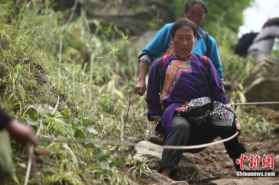 8月18日,汶川地區普降暴雨,岷江河水位再度上漲,由于汶川境內213國道仍然處于中斷狀態,受災群眾依然只能徒步翻山越嶺撤離家園,部分山勢陡峭,群眾只能靠繩索通往。中新社發 張浪 攝