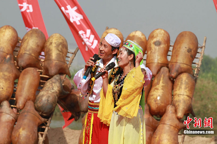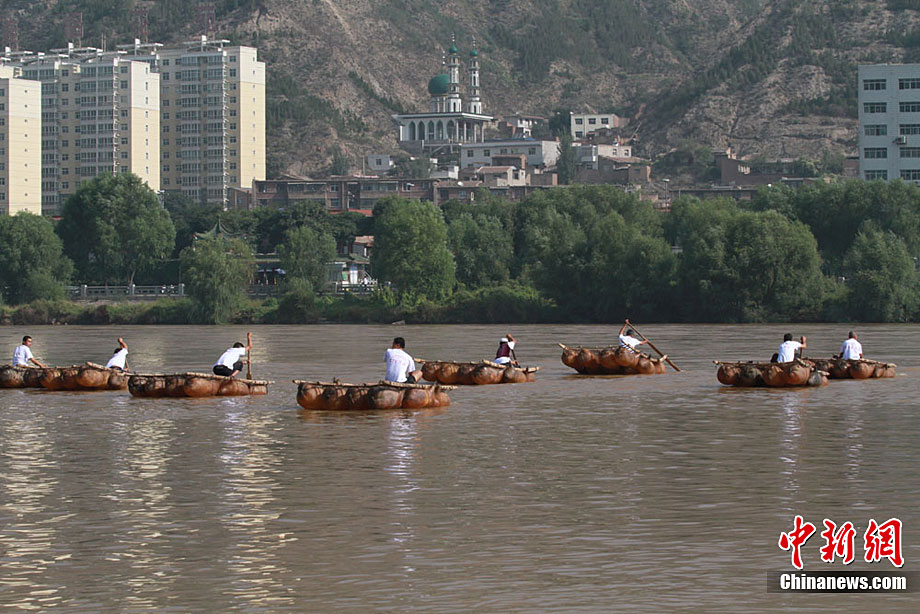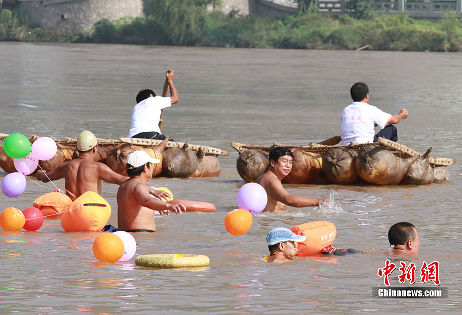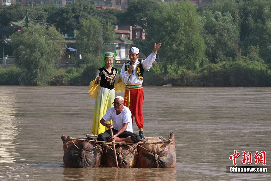 9月13日,蘭州第二屆羊皮筏子黃河漂流活動隆重舉行。羊皮筏子俗稱“排子”,是用山羊割去頭蹄,然后將囫圇脫下的羊皮扎口、吹滿氣而扎成,是一種古老的水運工具,如今已經(jīng)被淘汰,嬗變成當(dāng)?shù)匾环N旅游項目。中新社記者 殷春永 攝
