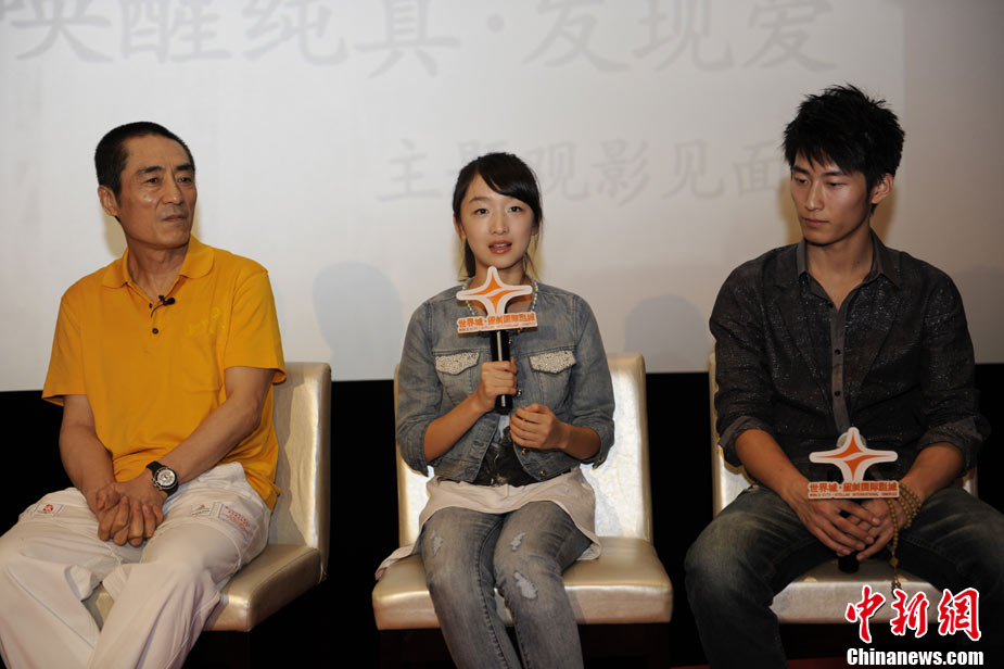 9月16日晚,由國際在線網(wǎng)站,中國國際廣播電臺輕松調(diào)頻91.5以及北京新畫面影業(yè)公司共同打造的“喚醒純真·發(fā)現(xiàn)愛”《山楂樹之戀》北京觀影見面會活動在世界城星美國際影城舉行。《山楂樹之戀》導(dǎo)演張藝謀攜影片兩位主演周冬雨和竇驍一同出席了活動,為觀眾講述了電影《山楂樹之戀》戲里戲外的故事。 中新網(wǎng)記者 王紅綱攝