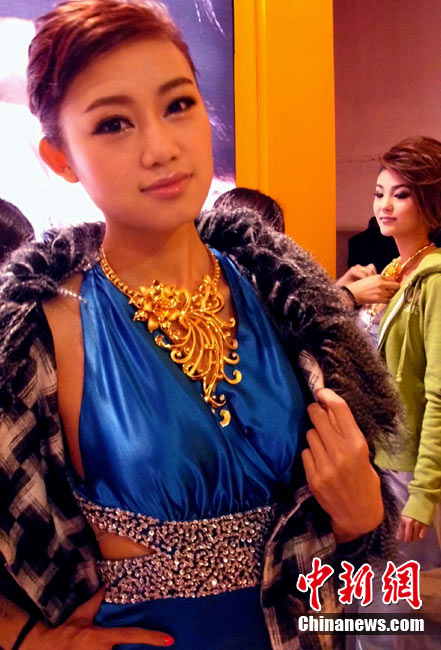 11月11日,2010中國國際珠寶展在北京中國國際展覽中心開幕,本屆展會規模42000平方米,近2000個展位,有來自22個國家和地區的961家企業參展,展覽面積比去年同期擴大了40%。圖為2010中國國際珠寶展上模特展示珠寶首飾。中新社記者 錢興強 攝