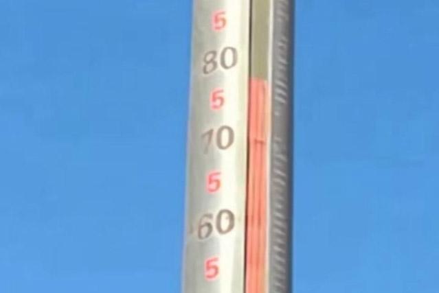 6月13日,吐魯番市火焰山景區內巨型“金箍棒”電子溫度計顯示溫度高達80攝氏度,吸引游客們爭相上前與之合影。陳學敏 攝