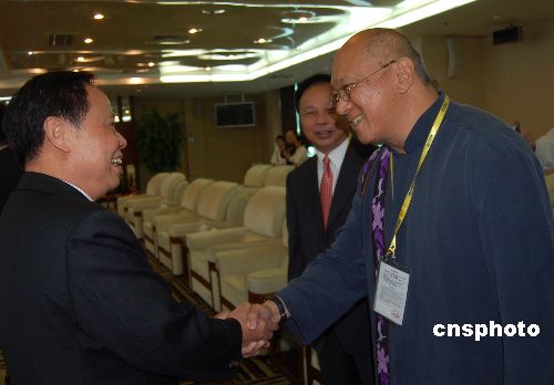 十月二十九日,二〇〇七海外華商相聚中國—東盟博覽會暨廣西商機介紹會在廣西南寧舉行,兩百名華商參加會議,會上簽約十八個項目,金額三點八六億美元。會前廣西壯族自治區主席陸兵(左)會見出席會議的著名僑領陳嘉庚先生的長孫、新加坡華德私人有限公司董事長陳立人。中新社發 劉萬強 攝
