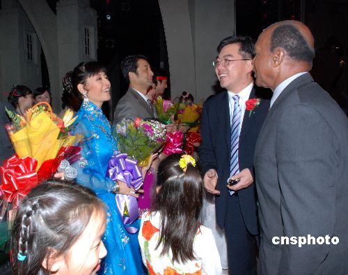 當(dāng)?shù)貢r(shí)間十一月十四日晚,中國(guó)南京藝術(shù)團(tuán)在美國(guó)芝加哥西北郊的珠瑞璉大劇院舉辦“和平頌”大型歌舞晚會(huì),中國(guó)駐芝總領(lǐng)事黃屏、伊利諾州州務(wù)卿懷特、芝加哥市長(zhǎng)代表李雙振等和近千名觀眾一起觀看了這場(chǎng)藝術(shù)精湛、反映蓬勃時(shí)代氣息的演出。特邀嘉賓、著名國(guó)家一級(jí)演員殷秀梅、男高音歌唱家呂繼宏和前線歌舞團(tuán)的四十多位演員們的演出,受到當(dāng)?shù)貎S胞的熱烈稱贊和歡迎。中新社發(fā) 張大衛(wèi) 攝