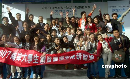 兩岸大學(xué)生二十五日共同攀登臺(tái)北一0一高樓,達(dá)成目標(biāo)后他們?cè)谝黄饸g呼慶賀。一年一度的“臺(tái)北一0一國(guó)際登高賽”今年首度設(shè)立兩岸青年菁英組,應(yīng)邀前來(lái)臺(tái)北研習(xí)、交流的中國(guó)人民大學(xué)、中國(guó)傳媒大學(xué)等學(xué)校學(xué)生與臺(tái)灣的同學(xué)約一百八十余人共同攀登這座世界知名的摩天大樓。中新社發(fā) 劉舒凌 攝