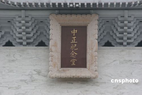 12月6日,臺灣當局已將臺北市標志性建筑“中正紀念堂”的牌匾拆除,將換上“民主紀念館”的新牌匾。圖為拆除前的“中正紀念堂”的牌匾。中新社發 耿軍 攝