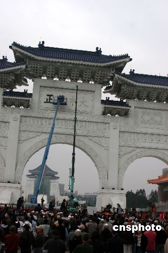 十二月七日,歷時近七個小時的施工,臺北“中正紀念堂”懸掛二十七年的“大中至正”牌匾被拆除。數百名民眾在大門外廣場觀看。中新社發 董會峰 攝
