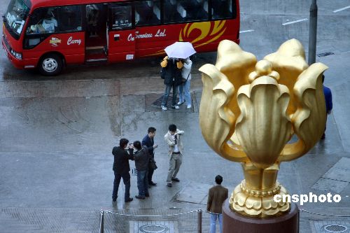 一月二十五日,由于香港受到寒冷冬季季候風影響,天文臺發出寒冷天氣警告,在細雨綿綿和寒風下金紫荊廣場游客明顯減少。中新社發 洪少葵 攝