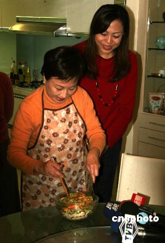 新春將至,臺灣二00八年“大選”國民黨副參選人蕭萬長的夫人朱俶賢(左),二月五日下午在友人家中做拿手菜“十全十美”,向民眾祝賀新年。中新社發 徐長安 攝