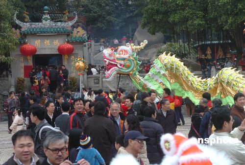 二月十日(大年除四),游客將澳門媽閣廟圍得水泄不通。初三之后,大批內地游客來澳門觀光度歲,各旅游點游客爆滿。中新社發 史利 攝