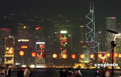 二月十日,游客在香港星光大道觀賞對岸風景。春節期間,維港兩岸紅燈高掛,增添不少喜慶的過年氣氛。中新社發 武仲林 攝