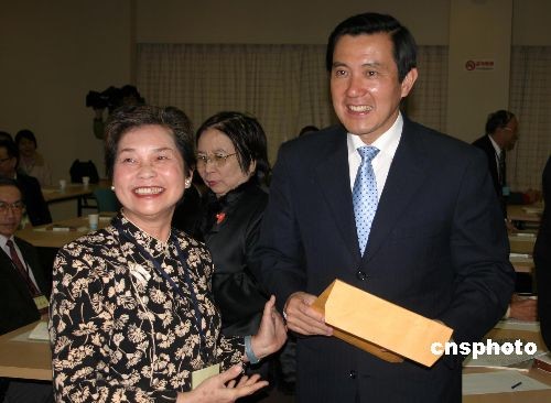 中國國民黨臺灣地區領導人候選人馬英九(中)出席會議并發表講話。