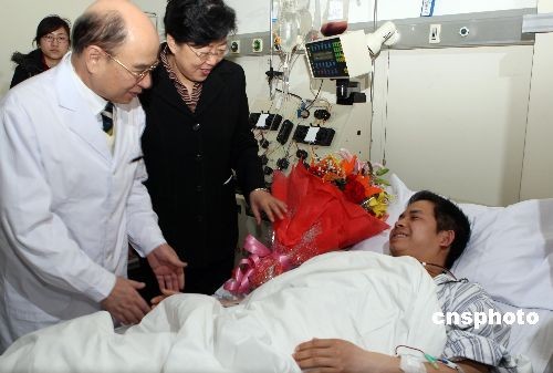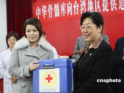 3月18日,中華骨髓庫向臺灣提供的第四例造血干細胞交接儀式在北京道培醫院舉行。來自廣西的陸先生與一位臺灣急性粒細胞白血病患者配型成功后,積極地捐出自己的“愛心血”。中新社發 趙雋 攝