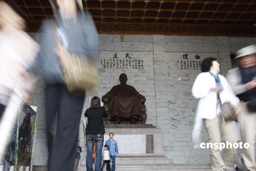 4月1日,因更名引發爭議的臺北“中正紀念堂”蔣介石銅像大廳懸掛的風箏已經拆除,目前剩下大廳中央的鋼架以及兩側的布幕尚未撤除。圖為游客參觀“中正紀念堂”蔣介石銅像大廳。中新社發 杜洋 攝