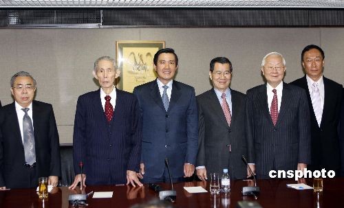 4月7日,馬英九與蕭萬長傍晚拜會臺塑集團創辦人王永慶(左二),就外界矚目聚焦的兩岸三通、大陸投資松綁等議題進行交談。這是馬英九選后“請益之旅”首度公開拜會企業界。中新社發 杜洋 攝