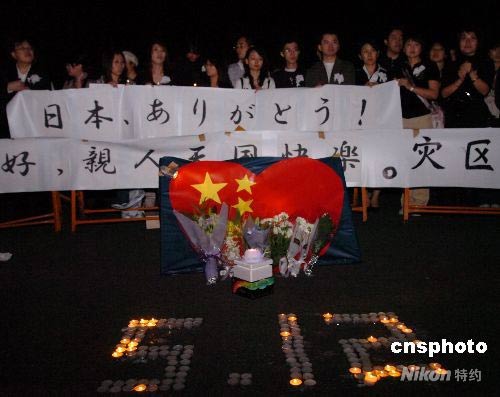 5月18日晚,150余位在日華人華僑和留學生自發來到東京市中心的新宿中央公園舉行燭光祈福活動,悼念5·12四川大地震遇難者。他們胸戴小白花、手持蠟燭,并打出“孩子一路走好”、“親人天國快樂”、“災區人民挺住”等橫幅。中新社發 朱沿華 攝