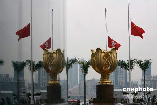 五月十九日是全國哀悼日,香港金紫荊廣場下半旗,對四川大地震遇難者表示深切哀悼。中新社發 武仲林 攝