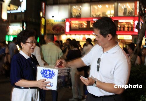 五月二十日晚,一名臺(tái)灣民眾在街頭見到為四川賑災(zāi)募捐的慈濟(jì)義工,毫不遲疑掏出一把鈔票塞入募捐箱。