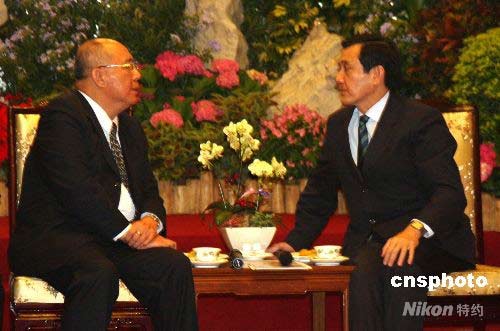 5月24日上午,馬英九、蕭萬長在臺北賓館與將于26日前往大陸訪問的中國國民黨主席吳伯雄一行茶敘,為其餞行。中新社發 陳立宇 攝
