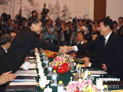 6月12日上午,海峽兩岸關系協會副會長孫亞夫(右)與臺灣海峽交流基金會副董事長高孔廉在北京釣魚臺5號樓協商兩岸周末包機。中新社發 任晨鳴 攝