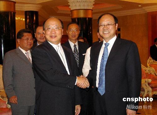七月七日中午,中共中央臺辦、國臺辦常務(wù)副主任鄭立中(前右),在廈門親切會(huì)見搭乘周末包機(jī)從臺中首航廈門的臺中市市長胡志強(qiáng)(前左)一行。圖為兩人熱烈握手致意。中新社發(fā) 楊伏山 攝