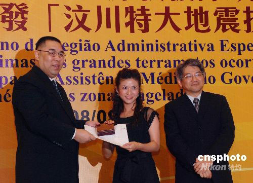 澳門特區政府社會文化司司長崔世安(左)及衛生局局長李展潤(右)九月三日晚向澳門援助四川地震災區的三批五十六名醫護人員逐一頒發獎狀及四川省政府贈送的“抗震救災紀念章”,以表彰他們的貢獻。中新社發 畢永光 攝
