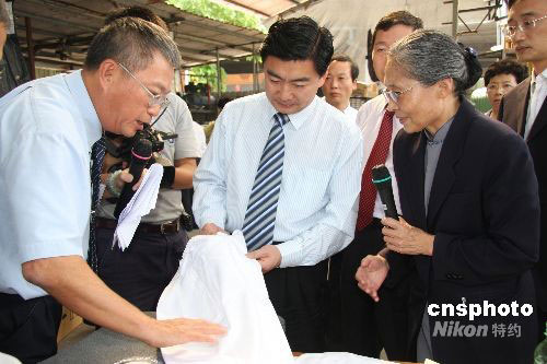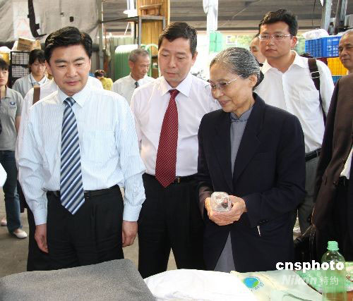 中共江蘇省委常委、蘇州市委書記王榮率領蘇州市副市長及太倉市副市長一行抵達臺灣參訪。十月一日下午,王榮一行參觀慈濟在臺北市八德路的環保教育站。慈濟的義工請王榮觀看她們用手中回收的這種塑料瓶加工制作的衣物和毯子,這些再利用的物品曾捐助四川地震災區。中新社發 耿軍 攝