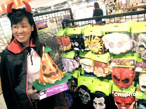 一年一度的萬圣節將至,香港一商場內的萬圣節裝飾多種多樣,吸引顧客。中新社發 張勤 攝