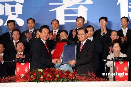 十一月四日,海協(xié)會與海基會在臺北圓山飯店舉行歷史性的會談后,大陸海協(xié)會會長陳云林與臺灣海基會董事長江丙坤下午十四時許在臺北就兩岸海運、空運、郵政、食品安全等議題簽署四項協(xié)議。中新社發(fā) 洪少葵 攝