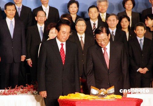 11月4日下午,海協會會長陳云林和海基會董事長江丙坤簽署有關兩岸空運直航、海運直航、郵政、食品安全的4項協議。圖為協議文本簽署后,陳云林向江丙坤致贈水晶作品《握手》。中新社發 黃少華 攝