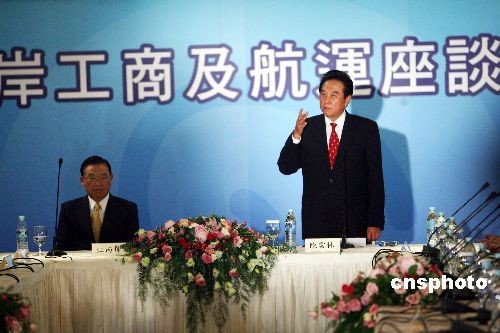 十一月五日上午,兩岸工商及航運(yùn)座談會(huì)在臺(tái)北圓山飯店舉行。海協(xié)會(huì)會(huì)長(zhǎng)陳云林、海基會(huì)董事長(zhǎng)江丙坤一同出席座談會(huì)。中新社發(fā) 洪少葵 攝