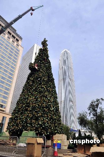 十一月十九日,香港工人正在港島中環(huán)地區(qū)裝巨型圣誕樹。香港特區(qū)旅發(fā)局今年覓得置地公司贊助,在皇后像廣場再亮起高三十米的圣誕樹,為香港繽紛冬日營造更好的節(jié)日氣氛。中新社發(fā) 譚達(dá)明 攝