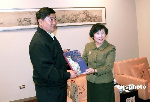 11月24日,國家文物局局長、中華文物交流協會會長單霽翔(左)率大陸多位文物界人士,參訪臺北故宮博物院,并與臺北故宮博物院院長周功鑫互贈禮物。中新社發 周兆軍 攝