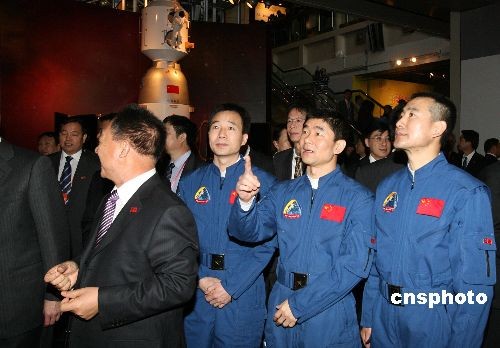 十二月六日,“中國首次太空漫步航天展”在香港科學(xué)館揭幕,神舟七號返回艙、航天服和航天員出艙后所展示的國旗等珍貴展品和圖片在展會上亮相。香港特區(qū)政府政務(wù)司司長唐英年、神舟七號載人航天飛行赴港代表團(tuán)團(tuán)長暨中國載人航天工程副總指揮張建啟、神七航天員翟志剛、劉伯明、景海鵬等出席揭幕儀式。中新社發(fā) 武仲林 攝