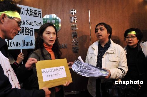 十二月十二日,香港數百名購買了雷曼相關產品的市民發起游行。圖為苦主代表向申訴專員公署投訴金融管理局監管不力。中新社發 譚達明 攝