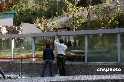 12月18日上午,臺北市動物園進行“游客參觀大貓熊動線測試”演練,檢驗動物園方面目前所規(guī)劃的館內(nèi)教育展示解說、游客流量、流速及動線順暢度。圖為工人在為“團團”、“圓圓”新家做護墻保潔。中新社發(fā) 劉舒凌 攝