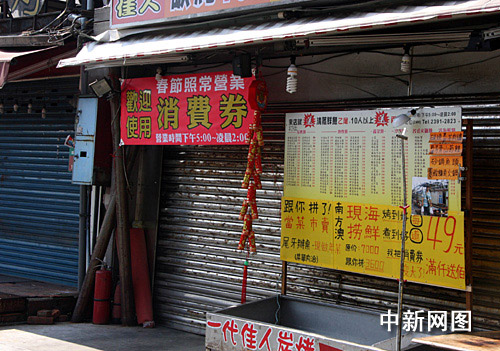 臺(tái)灣18日發(fā)放消費(fèi)券,看來很受歡迎。圖為臺(tái)北市新生南路一家飯館,下午五時(shí)才營業(yè),但今天早上已掛出歡迎使用消費(fèi)券招牌。陳立宇 攝