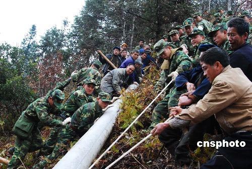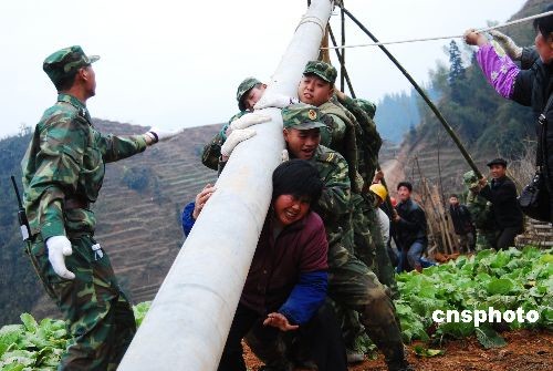 二月中下旬,駐廣西某部官兵在冰凍災區廣西龍勝縣同電力職工、當地群眾全力搶修因被冰災損壞的電力設施。中新社發 石團兵 攝
