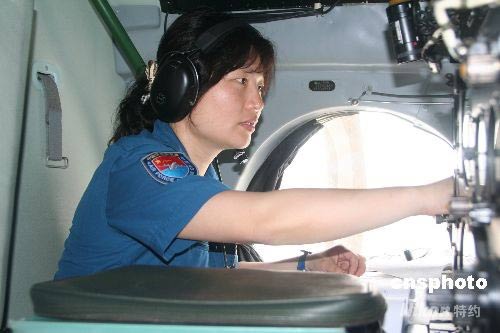 5月18日,中國空軍運輸航空兵某師七名女飛行員駕機升空直飛災區,緊急空運物資。上午11時33分,由女飛行員宋雪飛、王亞平、陳宇、陳金蘭、曹艷艷、王鴻、劉文力駕駛的7架飛機裝滿30多噸救災物資先后昂首起飛,15時38分全部到達成都雙流機場。圖為女飛行員檢查機載設備。中新社發 周建華 攝