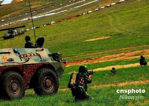9月中下旬,參加“礪兵-2008”的濟南軍區某機械化步兵旅,在塞北荒原綜合訓練基地進行實兵立體對抗演練。近百輛戰車和坦克兵分多路向“敵”陣地發起攻擊。中新社發 張振興 攝