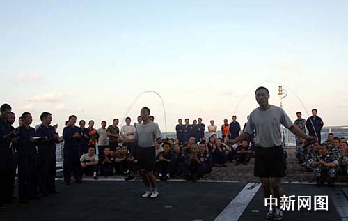 中新網“?凇迸1月10日電 當地時間1月10日下午,正在亞丁灣海域執行護航任務的“海口”號導彈驅逐艦繼續舉行甲板運動會,參賽官兵參加跳繩項目比賽。