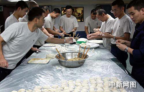 “海口”號導(dǎo)彈驅(qū)逐艦官兵包餃子過新年。中新社記者 孫自法 攝