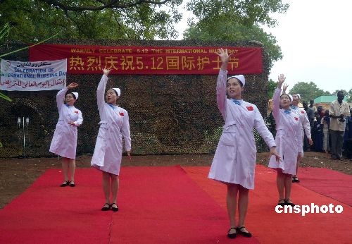 5月11日,中國赴蘇丹維和醫(yī)療隊醫(yī)護人員與蘇丹西加扎勒河州州立醫(yī)院的同行們歡聚一堂,慶祝國際護士節(jié)。歡慶活動中,我維和醫(yī)療隊捐贈了該院急需的抗生素、抗瘧疾、醫(yī)用耗材等六大類近50個品種的醫(yī)療物資,醫(yī)療隊將與州立醫(yī)院開展更廣泛的醫(yī)護交流和合作,為改善當?shù)氐尼t(yī)療衛(wèi)生狀況做出力所能及的貢獻。熱情淳樸的當?shù)孛癖娪米盥≈氐亩Y遇接待了中國朋友們。中新社發(fā) 隗蒙 陳晨 攝