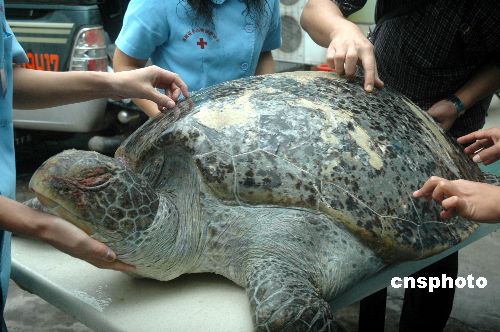 2007年11月1日,海南省小動物保護協(xié)會在海口市東海岸海邊救助一只約1米多長、重150公斤左右的國家二級野生保護動物綠海龜,移交給海洋漁業(yè)部門處理。該只罕見的綠海龜由附近居民發(fā)現(xiàn)后并自發(fā)呵護,但救助時已經(jīng)死亡。海南省漁業(yè)監(jiān)察總隊有關(guān)負責(zé)人稱,初步估計它至少有100歲以上,身上有多處傷痕,需要解剖才能查明真正死因,有關(guān)方面將把它制作成標本展覽,以教育人們保護海龜。中新社發(fā) 善平 攝