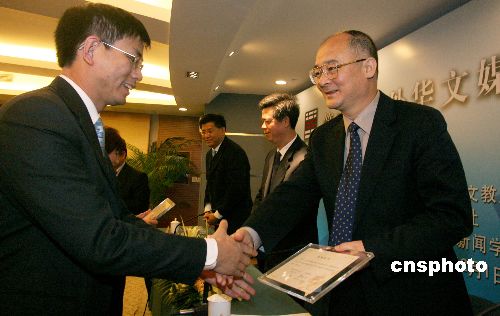 十一月三十日,“第三期海外華文媒體高級(jí)研修班”在北京結(jié)業(yè),國(guó)務(wù)院僑辦副主任趙陽(yáng)(右一)等出席結(jié)業(yè)式并為學(xué)員頒發(fā)結(jié)業(yè)證書。中新社發(fā) 張勤 攝