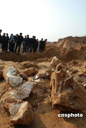 12月5日,山東淄博周村區王村鎮西道村磚廠挖掘出疑似“恐龍”的巨型動物骨骼化石。當日10點48分,正在淄博周村區王村鎮西道村磚廠施工的司機小郝,給村主任劉道新打電話說“挖掘機在工作時挖到了大量的化石,很像是動物的骨骼。”在現場進行保護的彭陽派出所的所長于成杰介紹說,這次挖到的化石很大,露出來的化石有6米多長,呈圓柱狀細端的直徑有18-19厘米,粗端的直徑有30-40厘米。其動物骨格的特征非常明顯,其體積顯然比大象要大的多,與史前動物“恐龍”骨骼化石極其相似。中新社發 梁寶海 攝