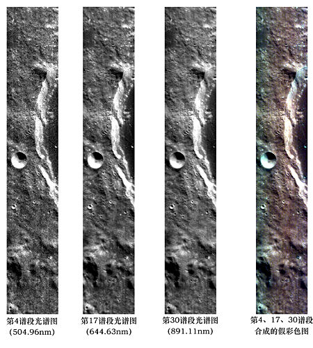 圖4展示的是11月27日04:54:27至04:56:10獲取的月表干涉成像光譜儀數據。該圖分別展示了32譜段中的第4、17、30譜段和它們合成的假彩色圖。
